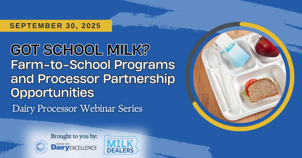 Dairy processors: This is the next webinar in our webinar series to help spur discussion, collaboration and innovation across the dairy supply chain. Join us on Tuesday, September 30 from 12:30-1:30 p.m. EST for the free webinar titled “Got School Milk? Farm-to-School Programs and Processor Partnership Opportunities.” Sign up for the webinar below! Connection details will automatically be sent to you via email after you sign up.