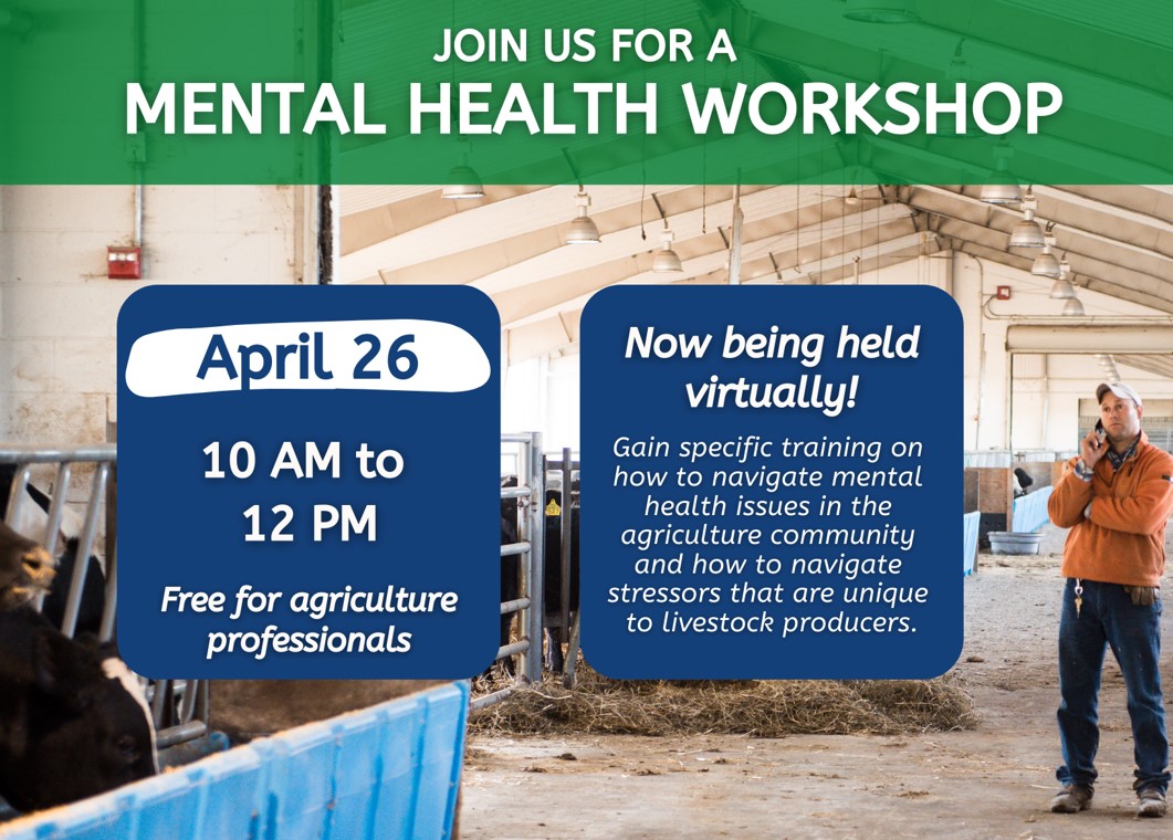 If you’re an agriculture professional who works with livestock producers, join us for one of six mental health workshops happening across the state! You’ll gain specific training on how to navigate mental health issues in the farm community. These workshops are ideal for anyone who is in contact with livestock producers and is concerned about their mental wellness and overall well-being. This might include lenders, ag agency personnel, nutritionists, inspectors and regulatory staff, veterinarians, educators, consultants, agronomists, and other ag industry professionals or farm family members.