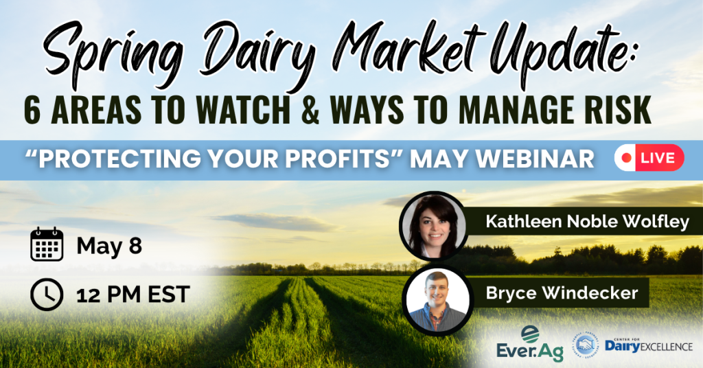 Spring has sprung! What areas should you be watching to manage risk and navigate changing dairy market dynamics during this busy planting season? Join us on Friday, May 8 at 12 p.m. EST, for this month’s “Protecting Your Profits” webinar titled “Spring Dairy Market Update: 6 Areas to Watch & Ways to Manage Risk.” Hear expert insight from Kathleen Noble Wolfley and Bryce Windecker from Ever.Ag. Click here to sign up for the webinar! Connection details will automatically be sent to you via email after you sign up.