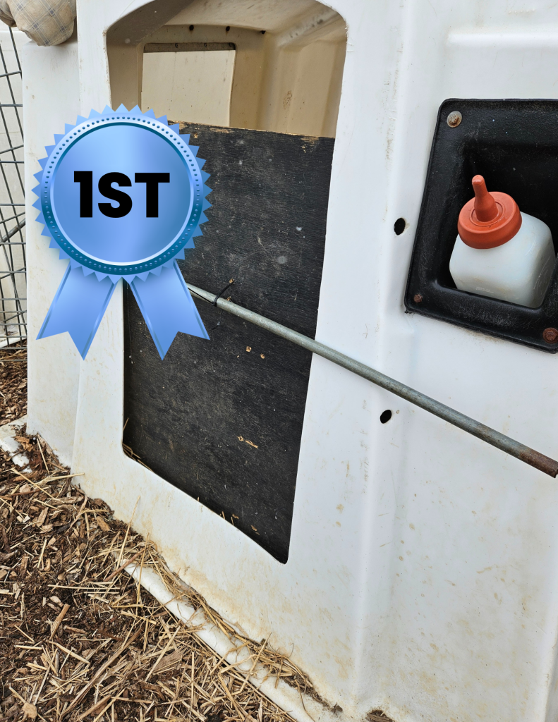 We created an accessory to use on our calf hutches to help protect newborn calves in winter months. We used a piece of plywood approximately 30 inches by 30 inches. We use it to cover the opening in our calf hutches to keep calves warmer until they are ready to face the winter temps but allow reasonable ventilation. To fasten it to the hutch we drilled 4 small holes so that we could insert two zip ties through them to hold one of the metal poles used to keep the wire hutch fences in place. The holes are about 12 inches in from either side and one about two inches above the other. We put the board inside the hutch, slide the pole through the zip tie on the outside, and it is held in place. The sizing allows air to move through the hutch but reduces the exposure for the first few days of the calf’s life. When temperatures allow, we take it out during the day and replace it at night until the calf is ready to experience the cold. It keeps calves body temps up and allows them to put more nutrition toward growth.