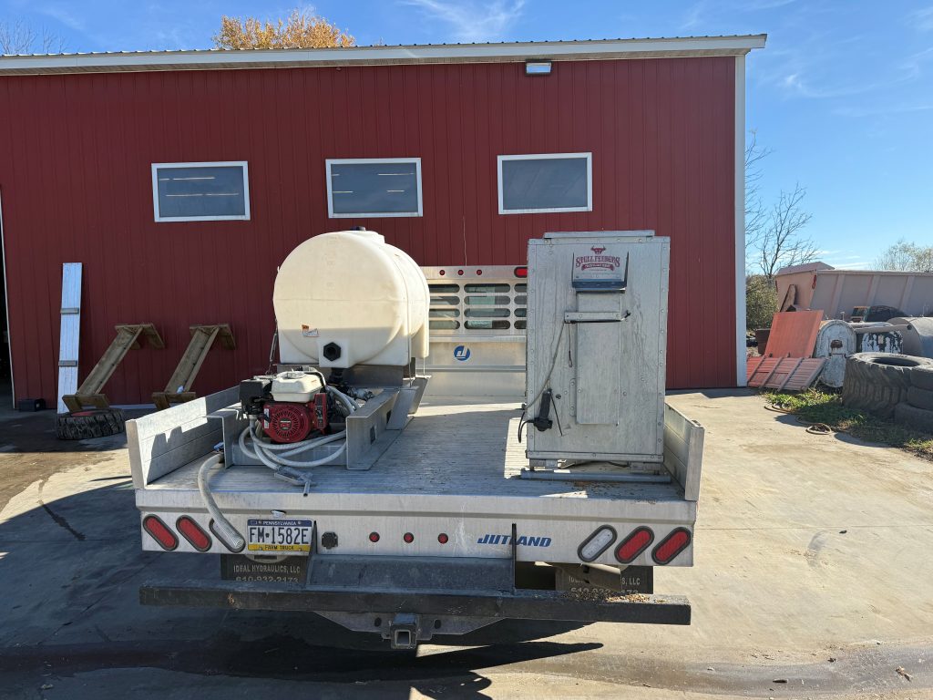 We call it our “Milk Taxi.” Our baby calves are housed approximately 3 miles from our main milking center. They are housed in group pens of 10 and are fed acidified milk, then grain and hay as they age. So we needed a inexpensive, simple solution to transport the milk and grain from our dairy to the calf facility. So we bought a used F450 truck and mounted a 150 gallon poly tank on it, bought a gas powered pump and the fittings from a local hardware store, and plumbed up a tank and pump system using a gasoline hose nozzle to dispense the milk. We also bought a 12 volt “grain feeder” from Stull feeders and mounted it on the same truck. This allows our youngstock technician to have the milk and grain all in one mobile place and saves a ton of hauling milk and grain with 5 gallon buckets! The grain feeder is mounted on a scale so we can accurately dispense the amount of grain we want to feed to each group.