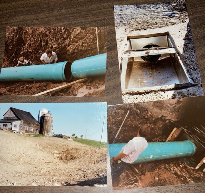 In 1992, we put an addition on our original barn and created a way of flushing the gutters with waste water from the milk house cleaning pipe line and bulk tank. We used 18″ PVC pipe buried underground from the barn to an old bulk tank for holding tank from which the manure slid down to the manure lagoon. The gutters behind the cows were dug in on a 4-8% grade to flow into the holding tank beneath the barn. PVC holding tanks are on each end of the barn to pump the water into from the cistern that collected the waste water. A stand pipe is pulled up on each one to release the water when it is full to flow into the gutters behind the cows. The gutters are 18″ PVC pipe cut in half and laid in the bottom and then cement poured to frame up to the barn floor and grating put over the top.